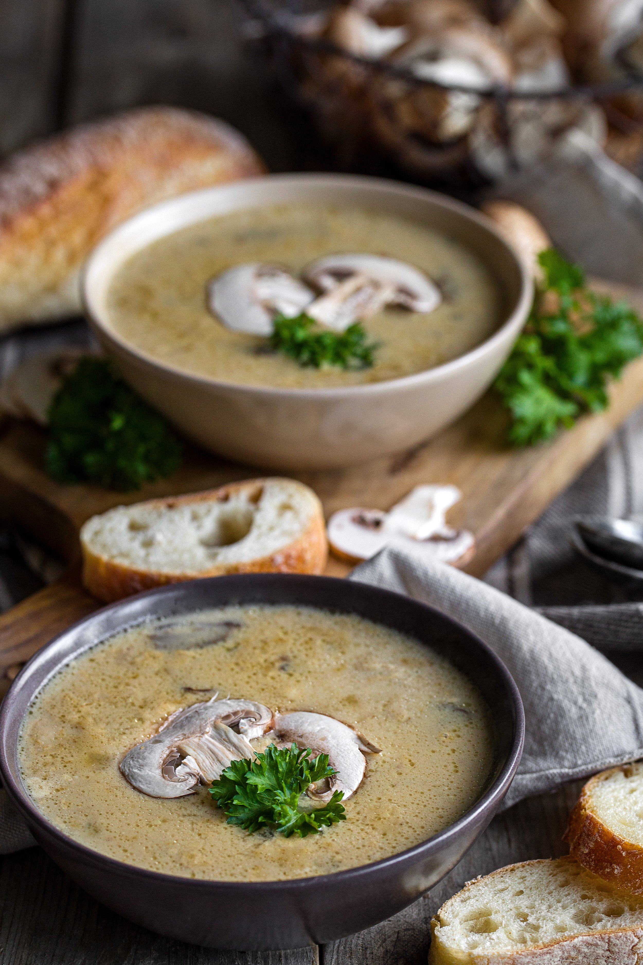 Serve in bowls and garnish with crème fraîche or fresh herbs like thyme, rosemary and parsley.
